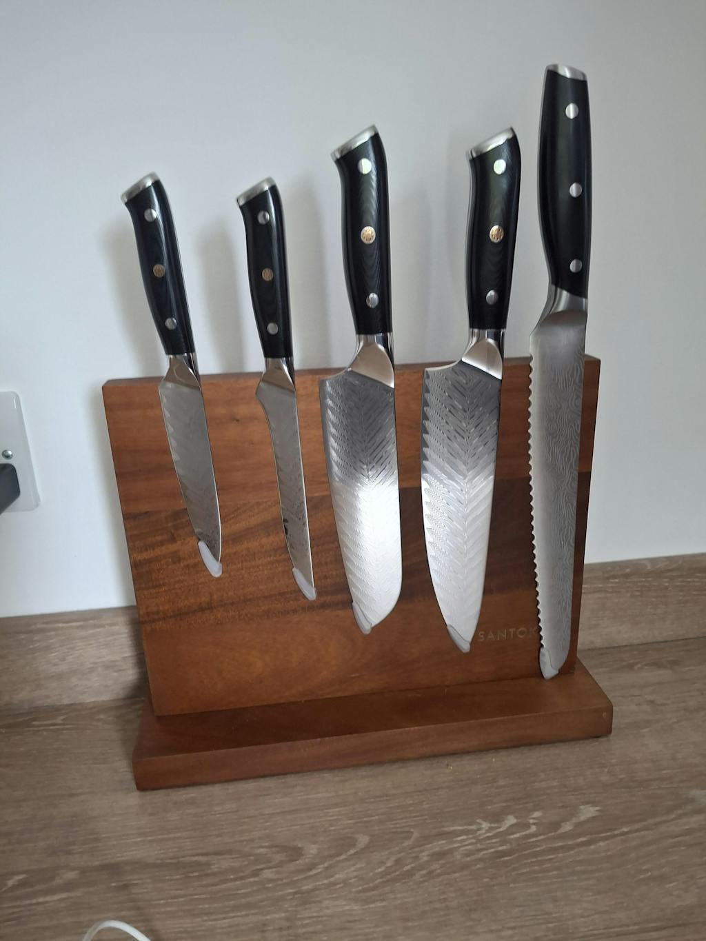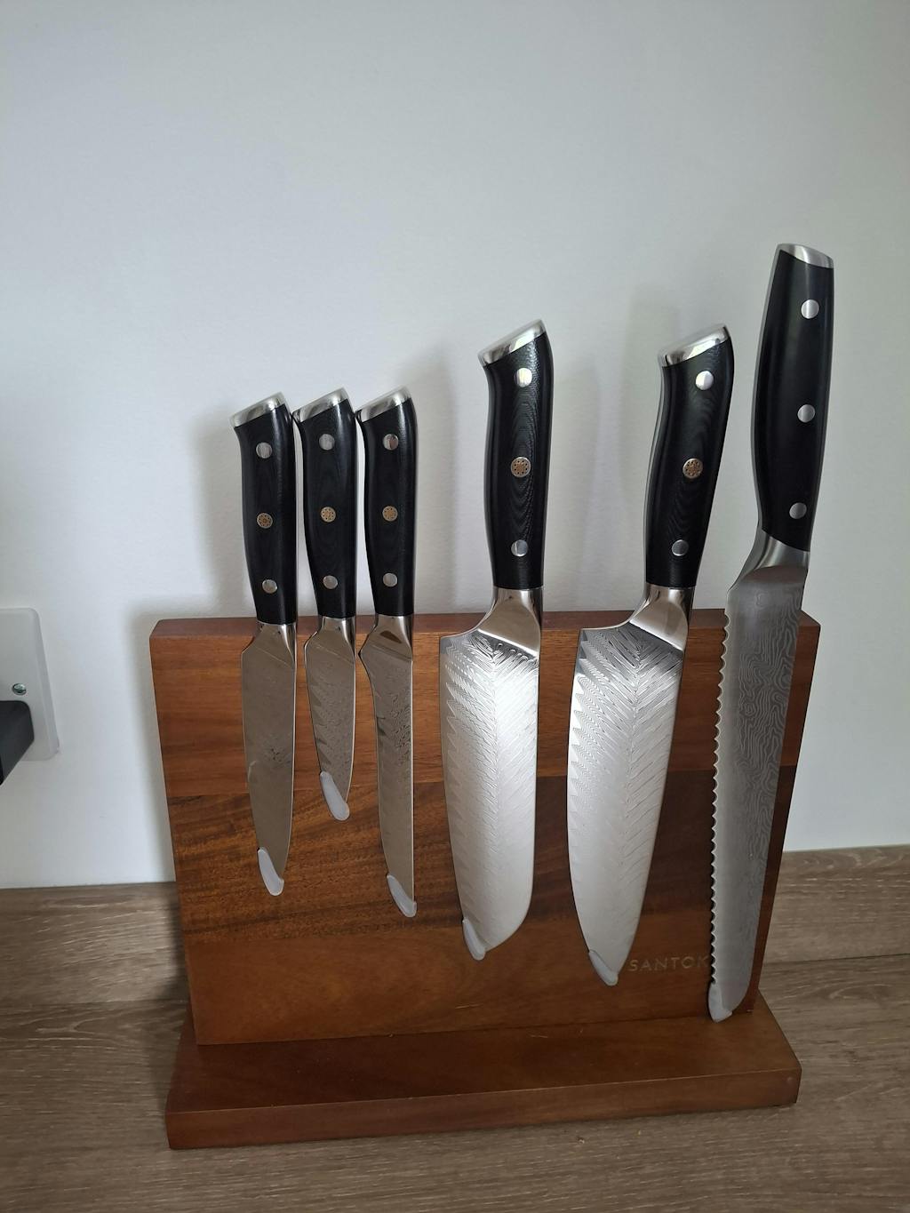 The optional magnetic knife holder is crafted from sustainably sourced Acacia wood— prized for its rich grain patterns and natural durability. With space-saving countertop design and powerful magnetic strips on both sides, it safely stores up to 10 knives while showcasing the beautiful precision-forged blades.